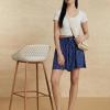 - PRODUCT DETAILS: Mid-rise, mid-thigh length flared fit shorts featuring an elasticated drawstring waistband detail.