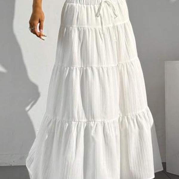 Full-length tiered maxi skirt with a wide flare offers a graceful silhouette that suits all body shapes—great for both casual and dressy looks.