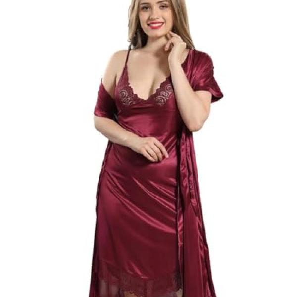 AV2 Women Satin Short Nighty with Lace & Robe 1306