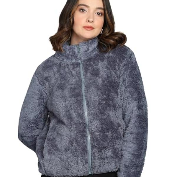 Alan Jones Clothing Women’s Fluffy Yarn Fleece Full-Zip Jacket | Soft Lightweight Warm Outerwear with Stand Collar & Piping at Hem & Cuffs
